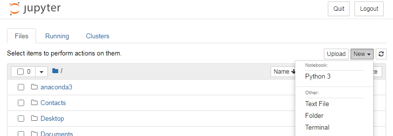 아래와 같이 인터넷 창에 Jupyter 화면이 뜨면 완료입니다.